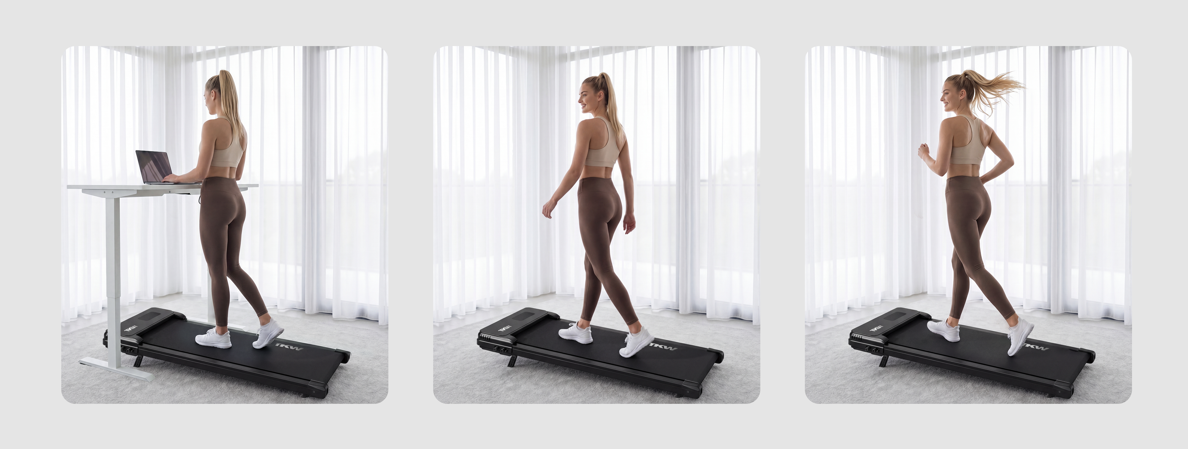 A: The TKW supports up to 300 lbs and reaches a maximum speed of 4 mph. It’s designed for walking and light jogging — perfect for daily health walking, under-desk use, and rehabilitation.